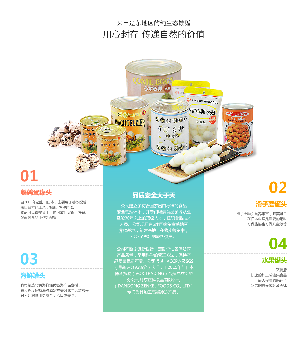 丹東日食食品有限公司是一家專(zhuān)注罐頭及速凍生產(chǎn)的食品加工型企業(yè)。公司主要產(chǎn)品為鵪鶉蛋罐頭、滑子蘑罐頭、冷凍產(chǎn)品等,年產(chǎn)量約5000噸。其中,鵪鶉蛋罐頭出口量位居近年國(guó)內(nèi)之冠;滑子蘑罐頭出口量也列國(guó)內(nèi)前位。各種產(chǎn)品主要出口日本,并遠(yuǎn)銷(xiāo)德國(guó)、澳大利亞、新加坡等國(guó)家和地區(qū)。